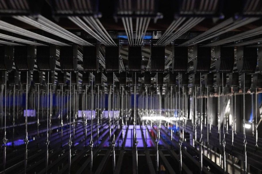 A big part of the reason why is the sheer number of operable elements in the fly system: There are no less than 75 “flybars” from which the scenery elements can be hung. Way up overhead are 750 pulley wheels, all connected by three and a half kilometres of hauling rope and 30 kilometres of steel wire rope, and to which 10 tonnes of counterweights can be attached.