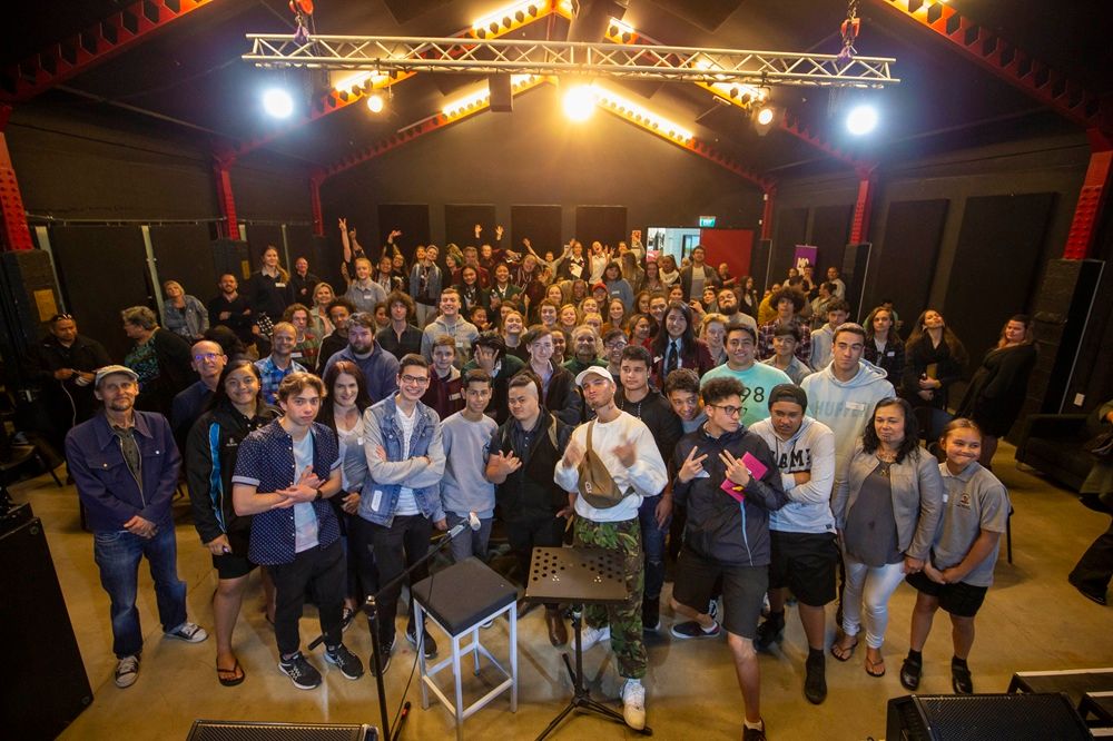 ABOVE: Stan Walker with Waikato students at a music workshop and Waikato Regional Theatre promotional event at Zeal Hamilton. PHOTO: Peter Drury.