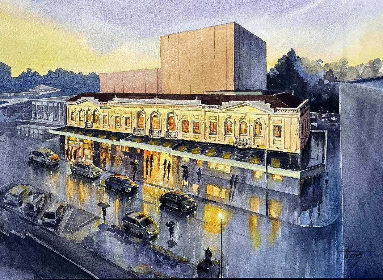 In her painting titled The Glow, artist Hong Cumming has presented an elevated view of the Waikato Regional Theatre that includes the original Hamilton Hotel façade and the cube-like structure housing the flying system - all wrapped up in some typical Hamilton weather.