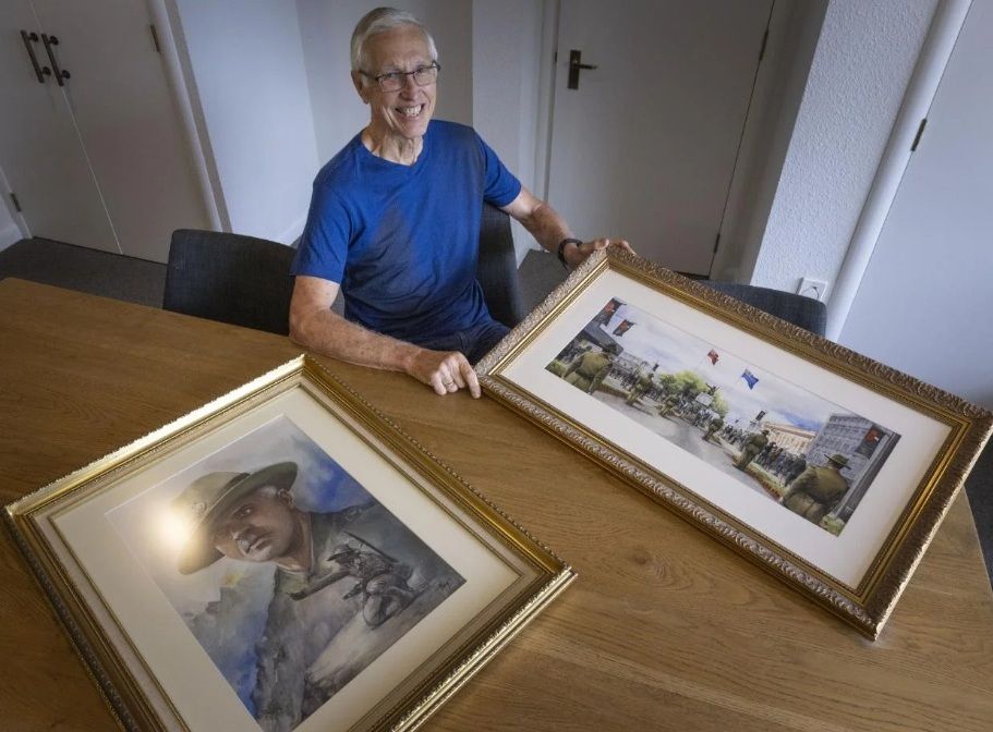 Outgoing Momentum Waikato chairman Neil Richardson with his own personal contribution to the BNZ Theatre: Two paintings by Hamilton artist Hong Cumming depicting Sapper Horace Moore-Jones and the statue erected in his honour. PHOTO: Kelly Hodel / WAIKATO TIMES.
