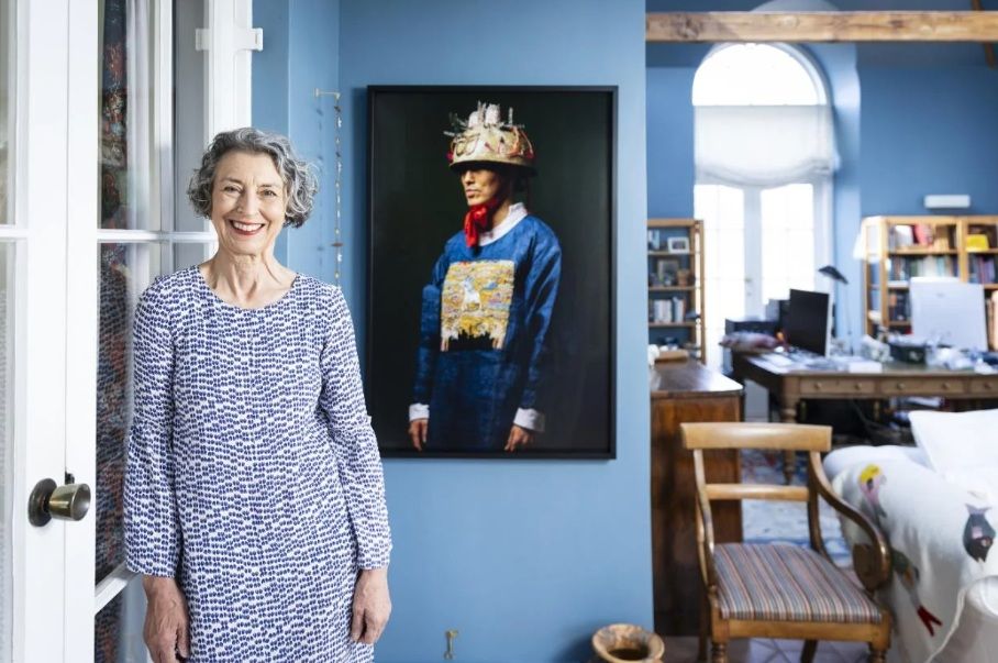 Former GP Linda Rademaker has been a tireless advocate for the Waikato Regional Theatre. The artwork on the wall behind her is a photographic work by Sung Hwan Bobby Park titled Ancestor Portrait, which earned the runner-up prize in the 2023 National Contemporary Art Award competition. PHOTO: Christel Yardley / WAIKATO TIMES.