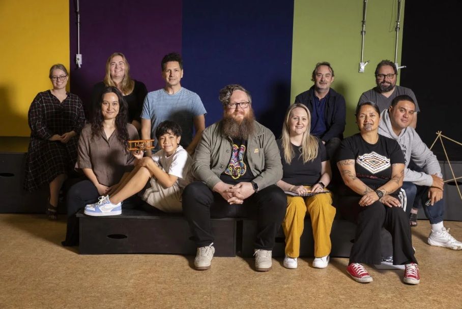 Part of the To The Stars/Ki ngā Whetū crew. Pictured at rear from left are Alexis Holmes (choreographer), Aimee Anderson-O'Connor (writer/poet), Mihailo Ladevac (actor), Scott Granville (writer), and Dan Inglis (writer/filmmaker). At front are Cian Parker (writer/actor), Silas Mark (actor), Jeremy Mayall (composer/co-Director), Courteney Mayall (co-director/performer), Maria Huata (writer/actor), and Michael Moore (poet/actor). PHOTO: Kelly Hodel / WAIKATO TIMES.